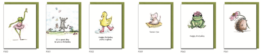 This lovely simplistic range featuring hedgehogs, frogs, toadstools and lots of other cute images was a big hit at the NEC and has been on lots of orders since. Moss Green envelopes cards are 125 x 175mm price code IJ